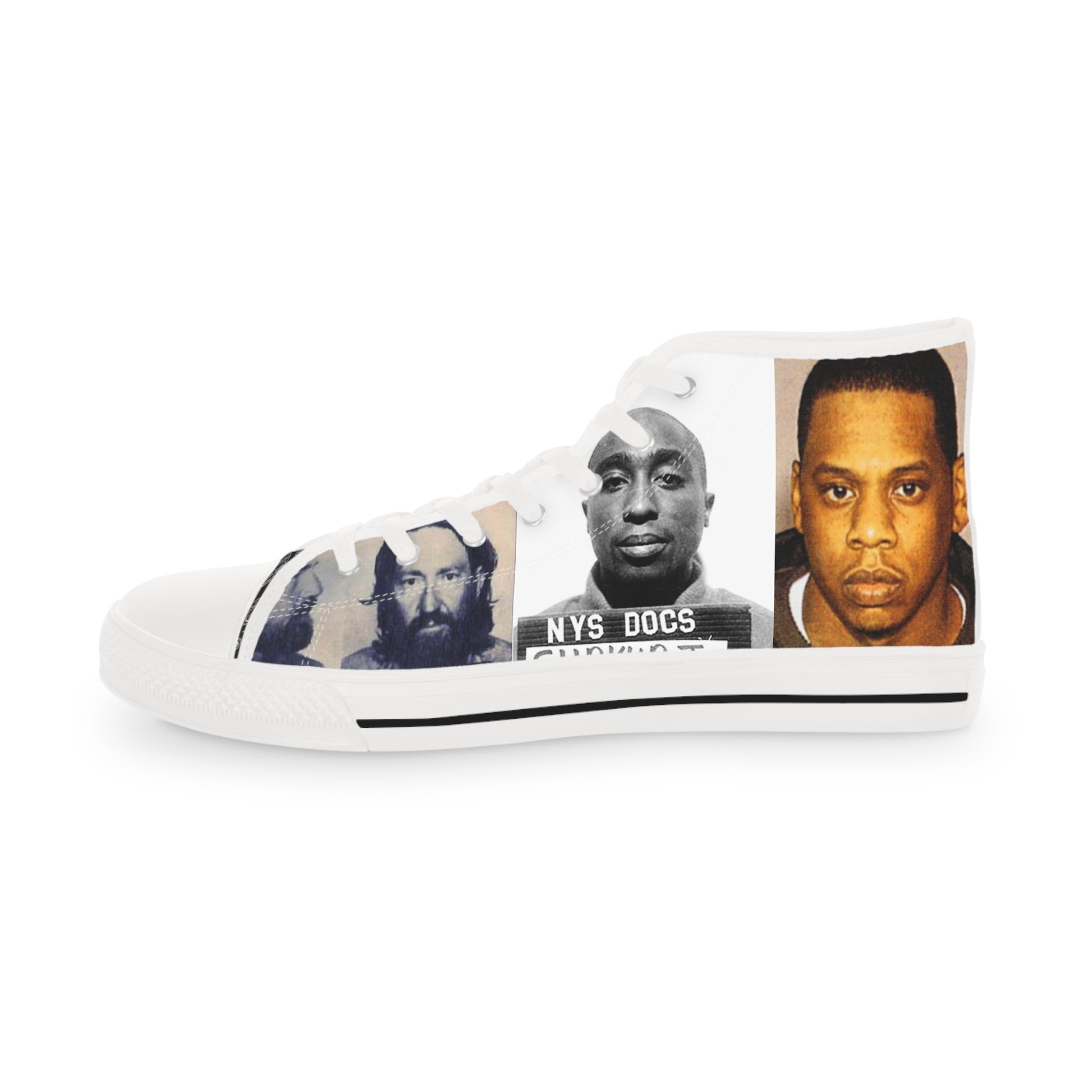 Unique, eye-catching, and stylish as hell. Made with breathable polyester canvas and featuring hi-poly deodorant memory foam insoles, these high top sneakers for men bear all the best mugshots and make an awesome shoe. Choose between black or white sole and laces, and enjoy the silver metal eyelets along with the lace-up closure. Orders are taking about 14 days give or take... please dont let this discourage you.... worth the wait!!!
